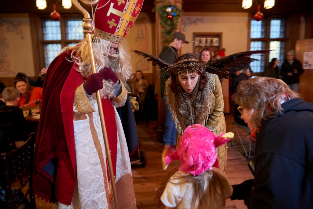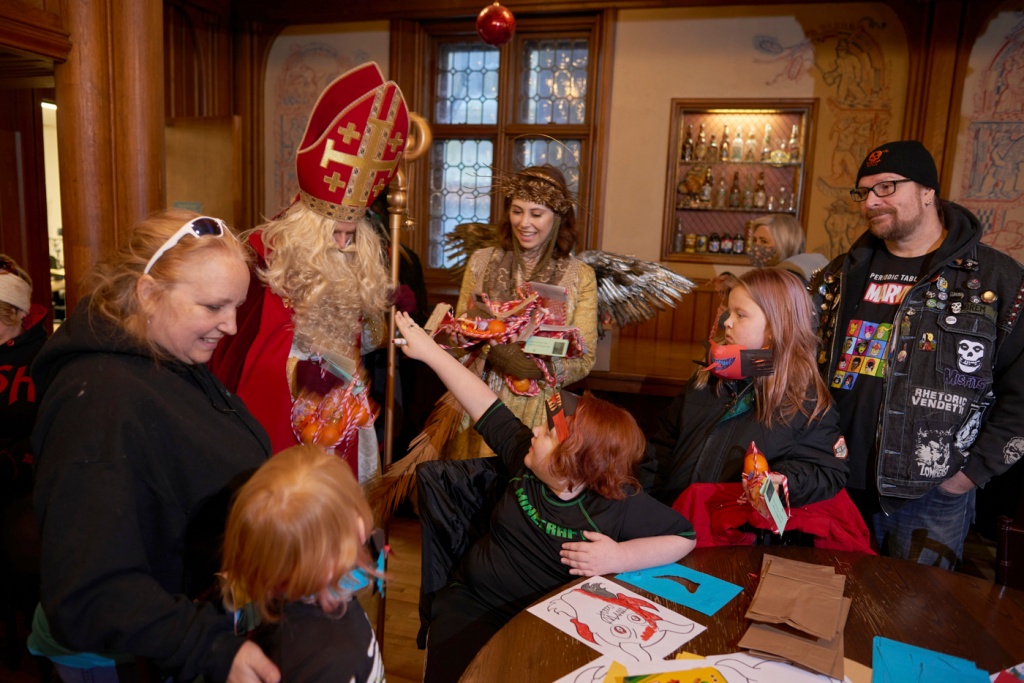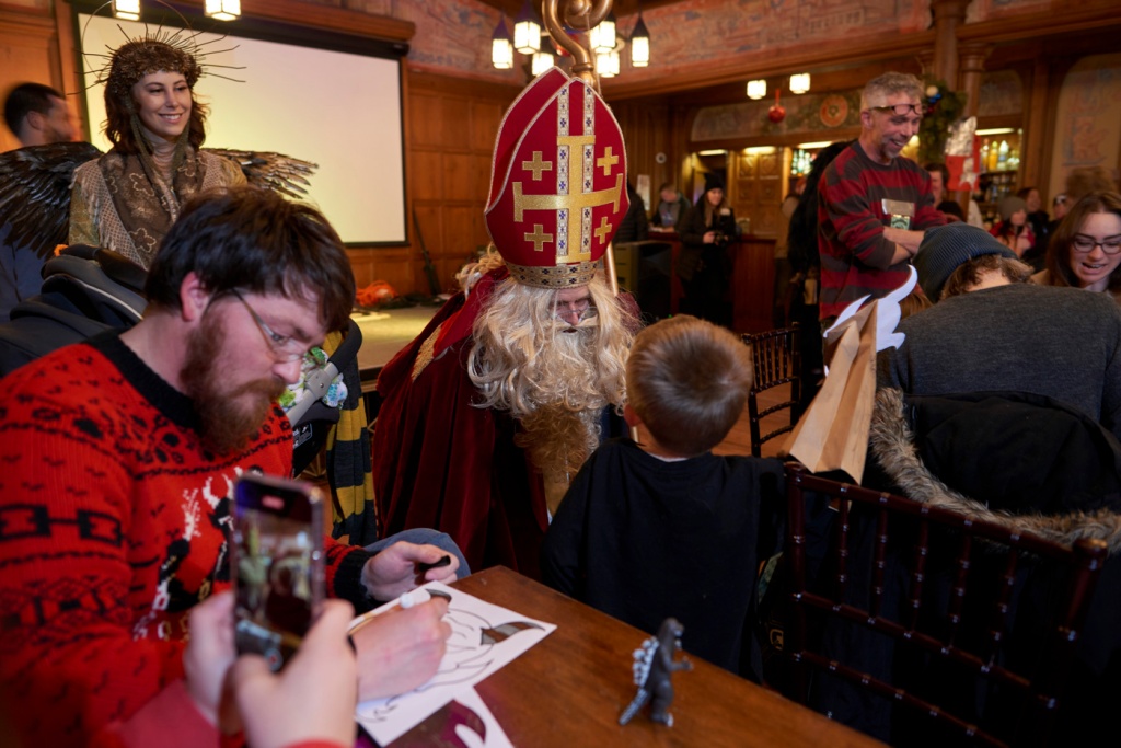 Outside the Blue Ribbon HallInside the Blue Ribbon Hall for Kid’s Krampus HourAt work on projects which included a Krampus mask, paper bag Krampus puppet, and a Krampus figurine made of aluminum foil.Working on the craft plan.Saint Nick shows up to greet the kiddos! But uh-oh, guess who is with him……that’s right, Krampus!And an angel, too!These performers are members of Milwaukee Krampus Eigenheit. They perform at Milwaukee Krampusnacht and other events throughout the year.Our sponsor Feral House provided each kid a stocking filled with treats.That’s a lot of treats!Only the good kids got the treats.Author and researcher Chad Lewis gave an engaging talk presentation on “Folklore and Legends of Winter.” Sold out room for the Chad Lewis presentation. It was followed by a “Make Your Own Krampus Card” workshop.