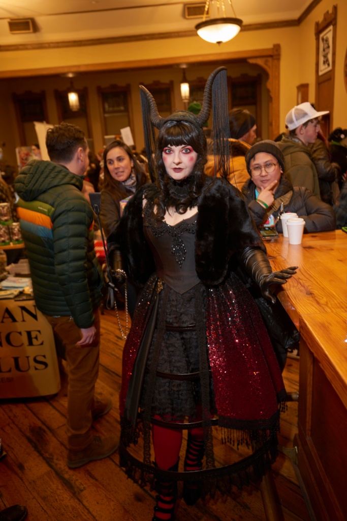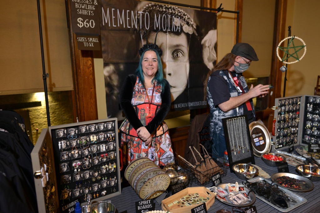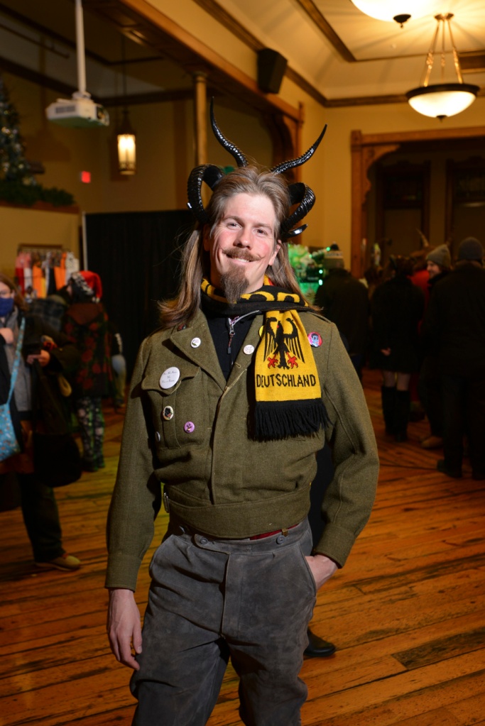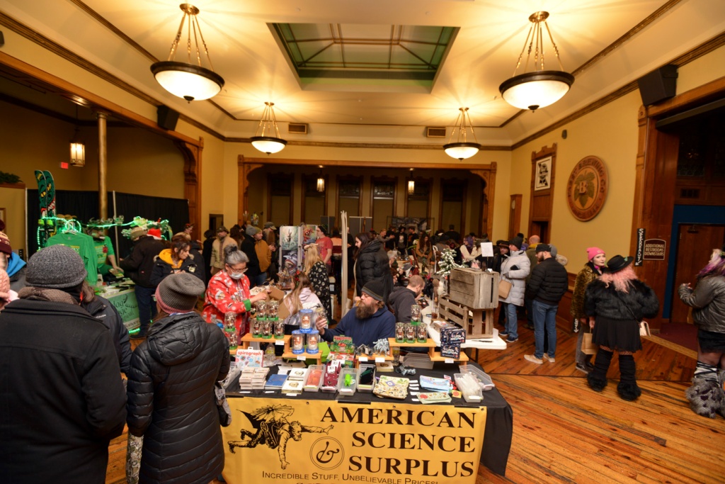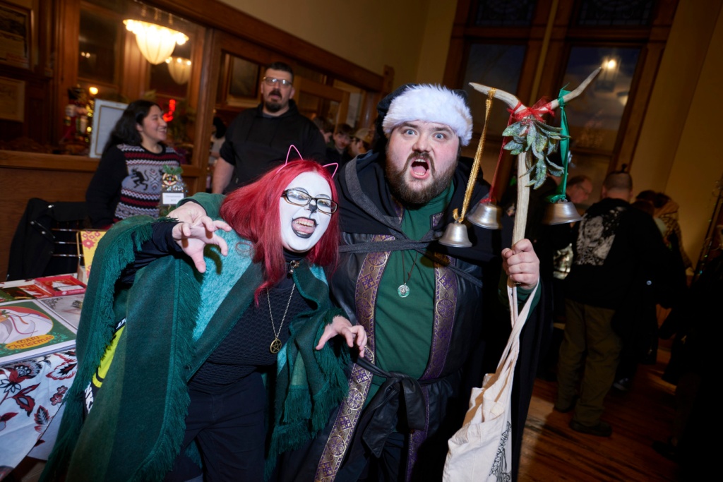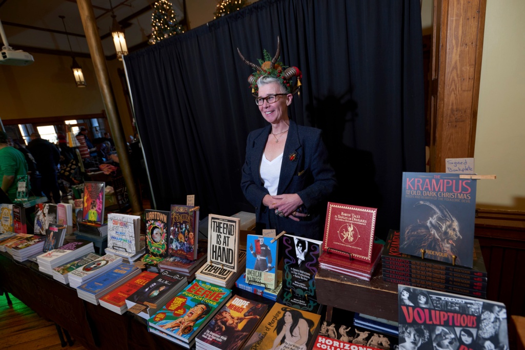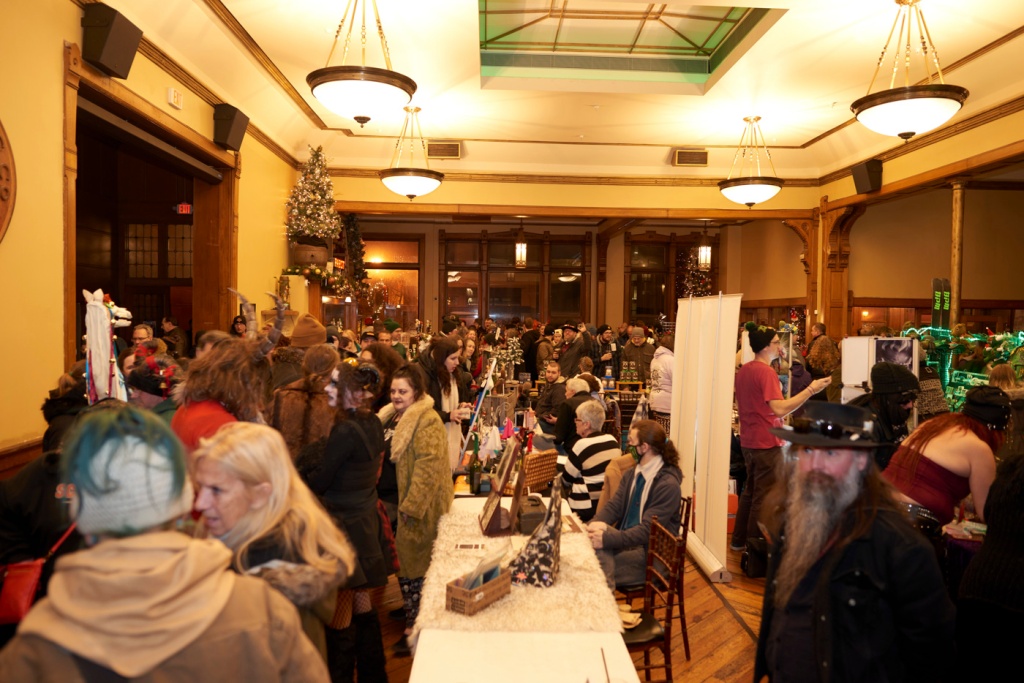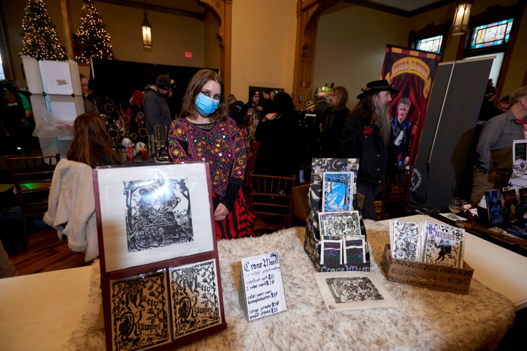 Outside the Great HallInside the Great HallEvent sponsor American Science & Surplus, our favorite store!Krampusnacht attendeesEvent sponsors Feral House, publishers of “The Krampus” by Al Ridenour, among many other fine books.Stinky Goblin Emporium. They are the ones who create our badass art every year for our T-shirts and other merch. Krampusnacht attendeeVendor Momento MoiraVendor Beyer BewareKrampusnacht attendeeEvent sponsor Hellfire Hot Sauce. Were you brave enough to sample?One of our traditions is a white elephant exchange. This year it was set up in Capt. Pabst’s former office. Some say Capt. Pabst’s ghost still wanders the building. This year we also set up a memorial to some participants and friends of the event who have passed on– Scott Wolter, Curtis Meyer aka Deadgar Winter, Linda Godfrey, and Louis Dubrosky. Thank you to Estephanie Mendoza for setting this up. Speaking of, here’s the table for Mendoza Illustrations . Vendor Pieces of Jayde: Uncommon Goods, who traveled up from Indiana.Krampusnacht attendeeCrone Moon, who also led a wonderful “Make Your Own Krampus Card” workshop. Krampusnacht performer/attendeeVendor Gebhardt Trading CompanyNext door to the Great Hall– the Best Place Gift Shop.