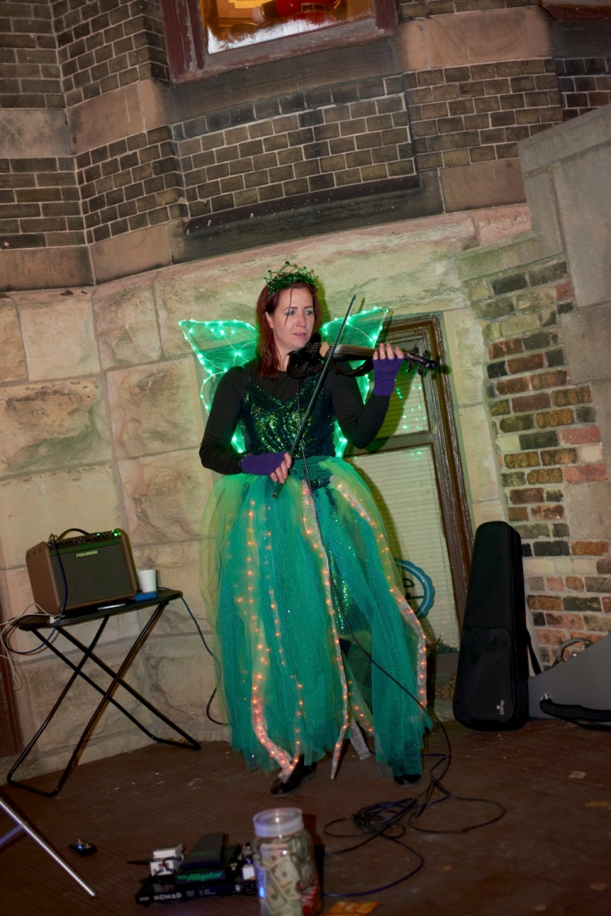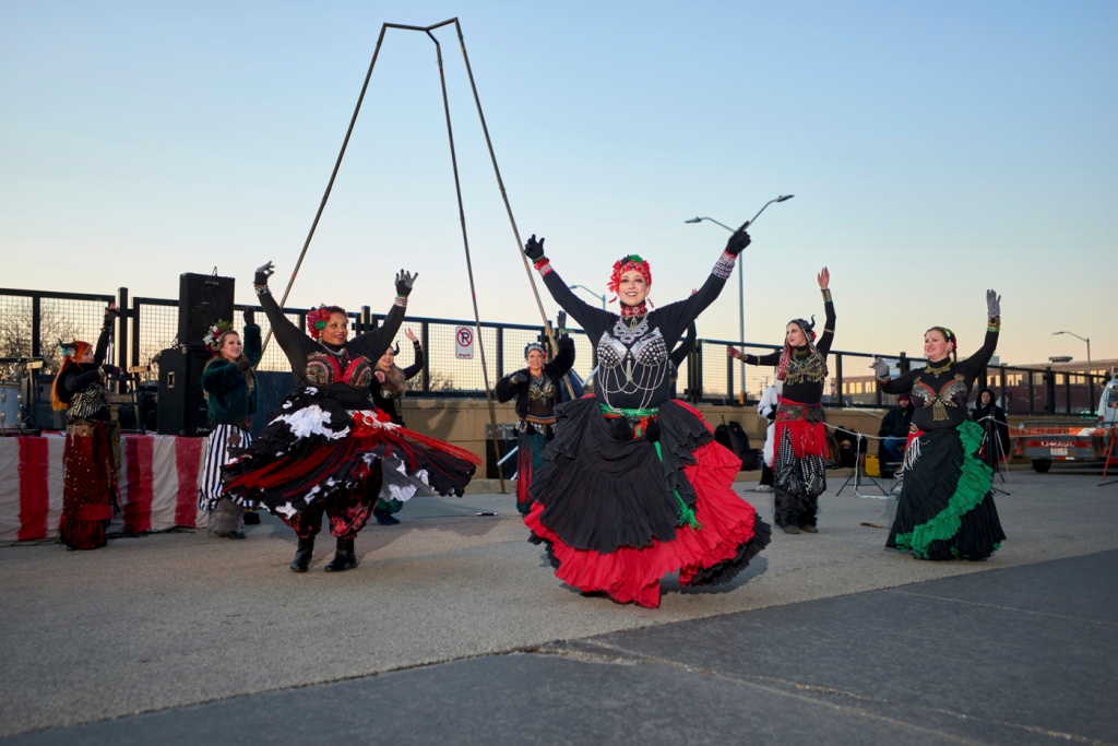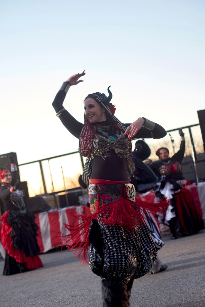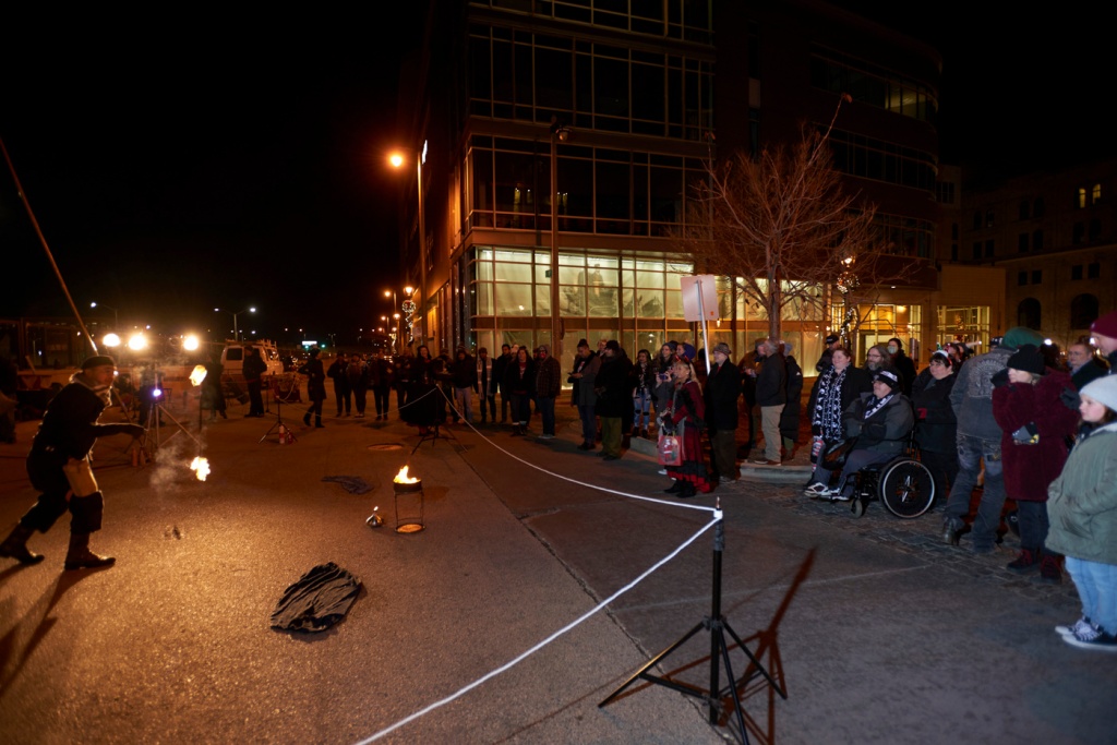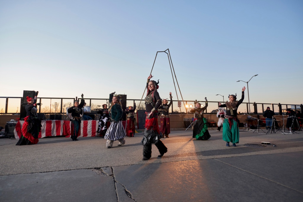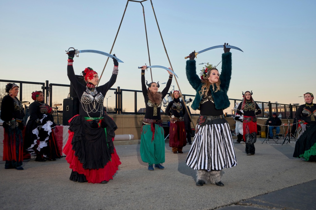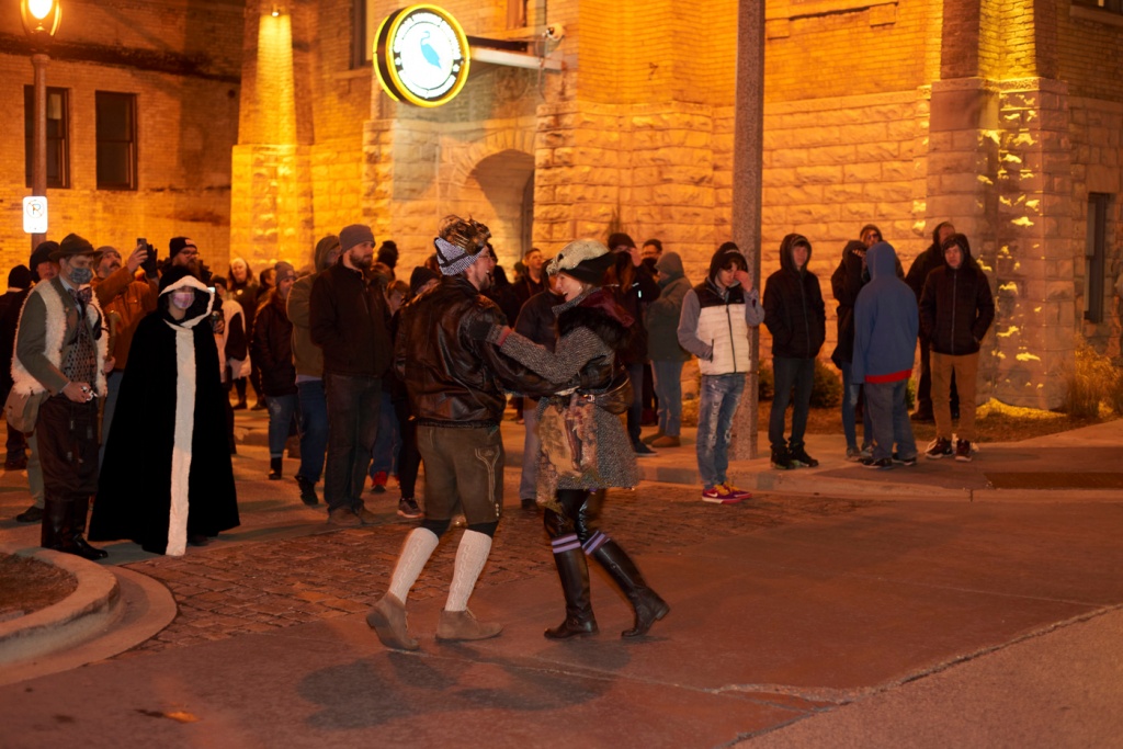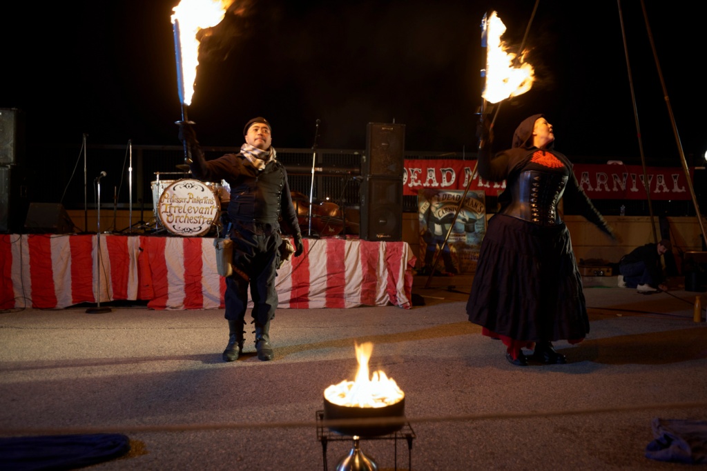 Tamarind Tribal Belly Dance giving a performance at the Dead Man’s Carnival 11th Street Stage near Central Waters Brewing.Be careful with those!Tamarind Tribal Belly DanceThe setting sun was a nice touch on Tamarind Tribal Belly Dance’s performance. A nice view of some of the historic Pabst Brewery buildings. The building on the corner is now Central Waters Brewing. Tamarind Tribal Belly DanceThe Courtesan and the Cabin Boy “All Fired up for Krampus” firedance show. Swords of flame!The Courtesan and the Cabin Boy: “All Fired Up for Krampus!” Professor Pinkerton’s Irrelevant Orchestra, the Dead Man’s Carnival House Band.People dancing in the street to Professor Pinkerton’s Irrelevant Orchestra.