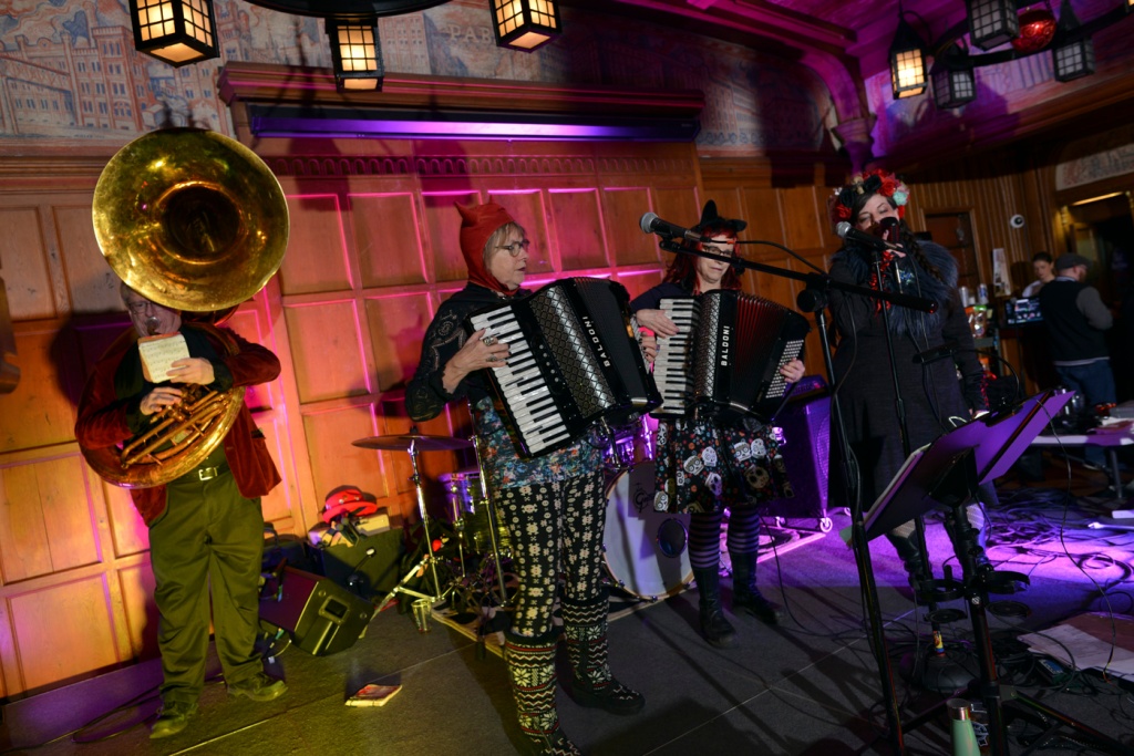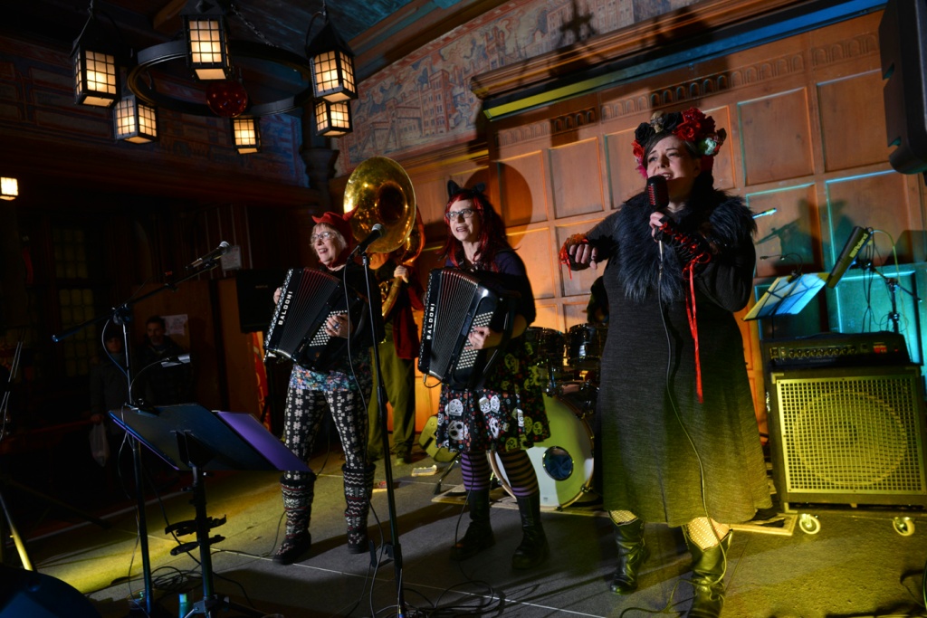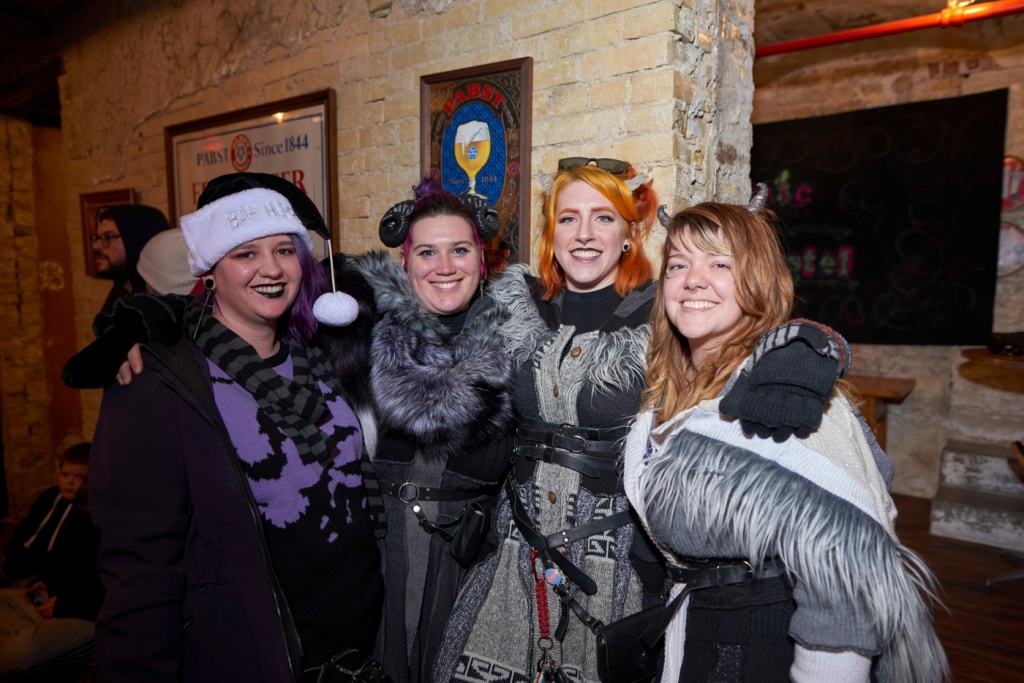 American Ghost Walks banner holders lead the way.Spielmannszug Milwaukee Drum and Bugle Corps http://szmke.org/has been an organization since 1957!Mari Lwyds!Zombie Caroler ChoirThe Hodag Store‘s Krampus and St. Nick Hodags!Tamarind Tribal Belly DanceWitches in Motion and Wend O’ LynnThat tall creature is Jólakötturinn, the ferocious Icelandic Yule Cat! See: Icelandic Christmas folklore – WikipediaPuerto Wiccan with a crew of creepy elves.Here’s Krampus herder Saint Nick with members of Milwaukee Krampus Eigenheit and other other guest Krampus performers!Katie Kadaver of Grindhouse Tease was also one of our t-shirt models this year. Angel handing out candy.Look out for that switch!Uh-oh, looks ready to whip someone’s ass!The Squeezettes playing the Post-Parade show in the Blue Ribbon Hall. Looks like they’re dancing a Krampus polka.The crowd enjoying The Squeezettes.Cheers to our host, Best Place!After The Squeezettes played, Xposed 4heads took the stage and humored the audience by playing their hit song “Dance with the Krampus” not once, but twice. And that was a wrap on Milwaukee Krampusnacht 2022!